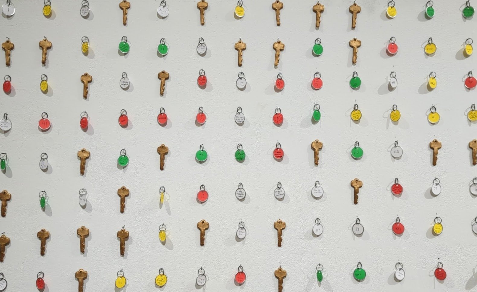 By EROS C BACKUS | eroscbackus@gmail.com | initially comprised of 104 mold made ceramic keys, now holding zero of those original keys and 103 thoughts, messages, apologies, letters, questions and answers and one metal key whose duplication though prohibited was cultivated