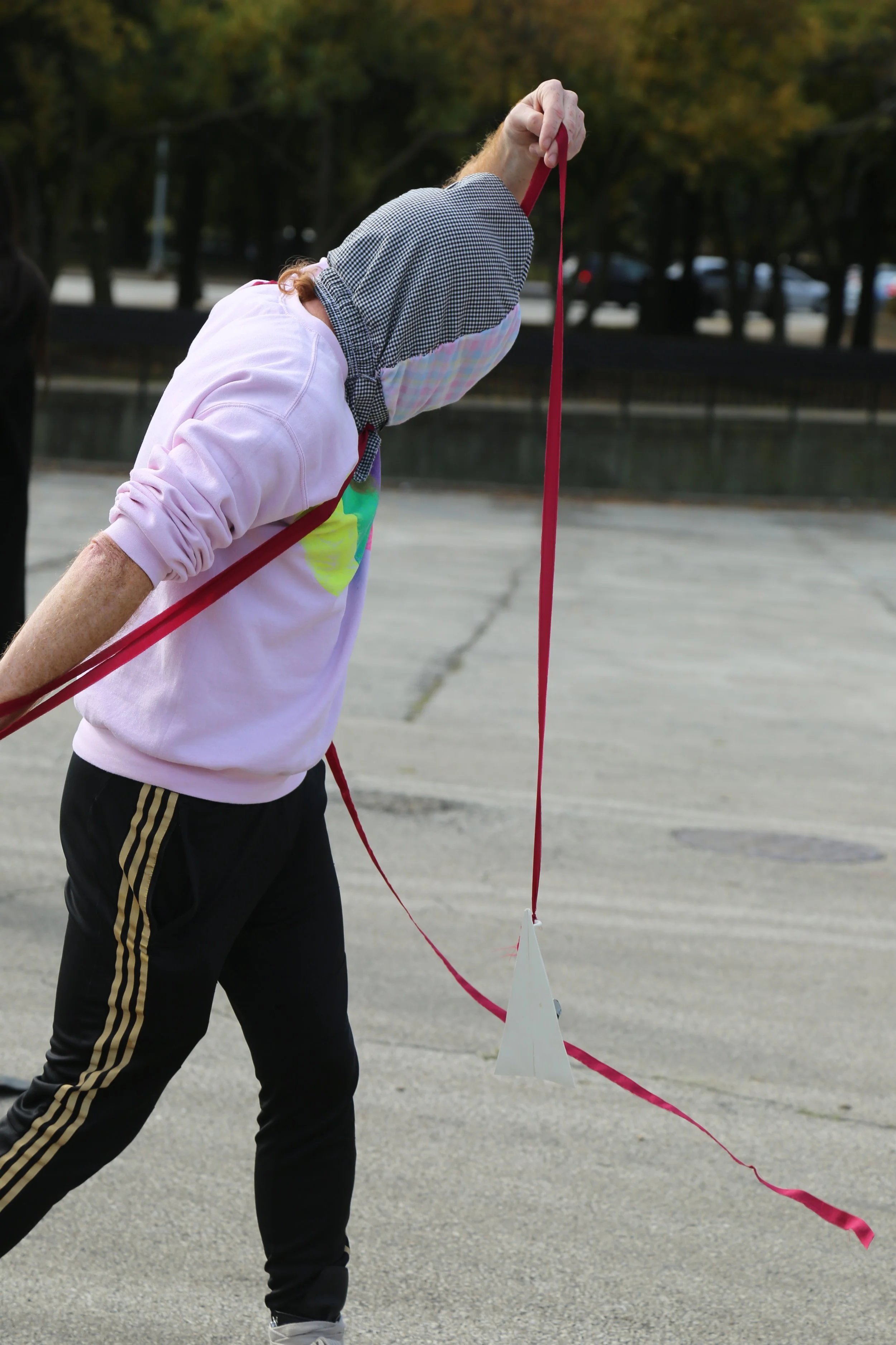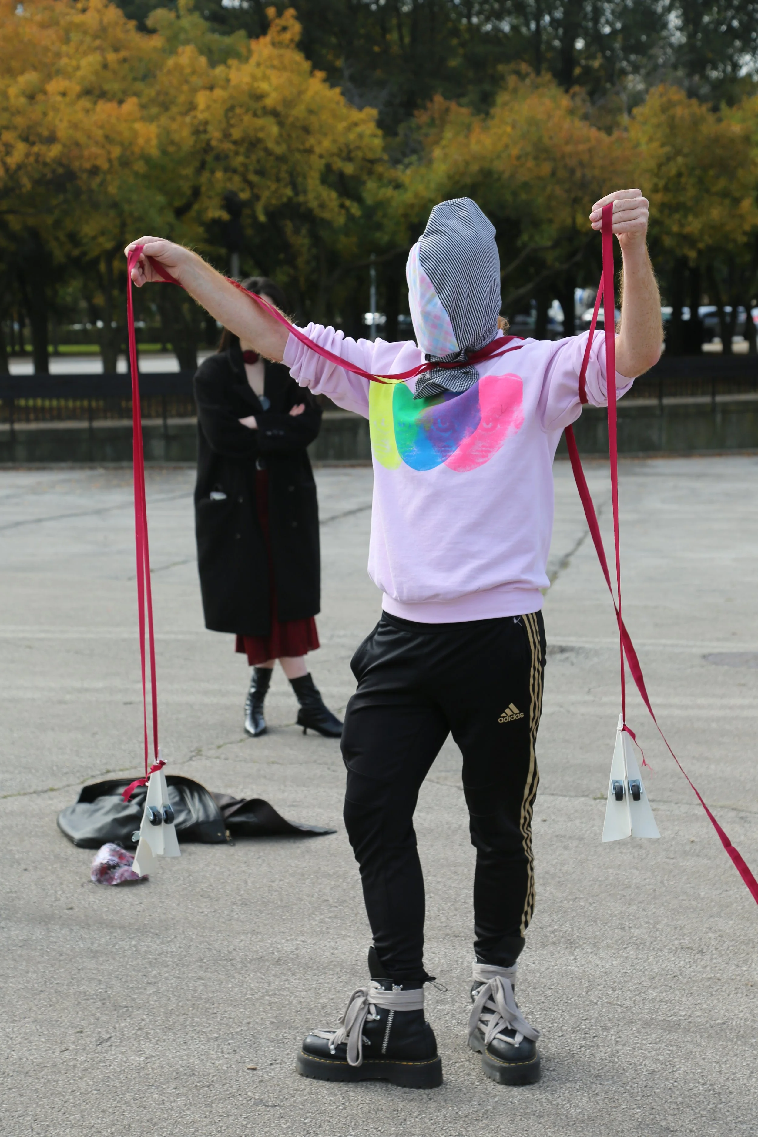 On October 23rd, 2023, Performing the Rural, a performance class at School of the Art Institute of Chicago led by Mark Jeffrey and TA’d by Maddison Parker, took to the skies…in their own way. Inspired by a kite festival that SAIC had held in 1957 and having found success in holding one the year prior, Mark Jeffrey tasked his students to create kites and masks that served as representations of their work and practice for a midterm kite festival. Initially intending the kites to be sky worthy he instructed his class to sketch their pieces and informed them on ways to build the tethers and anchors. However, ever the performance artists, his students decided to take the terminology of “flight” in their own way with kites ranging from porcelain ‘paper’ airplanes to a small collection of helium balloons.