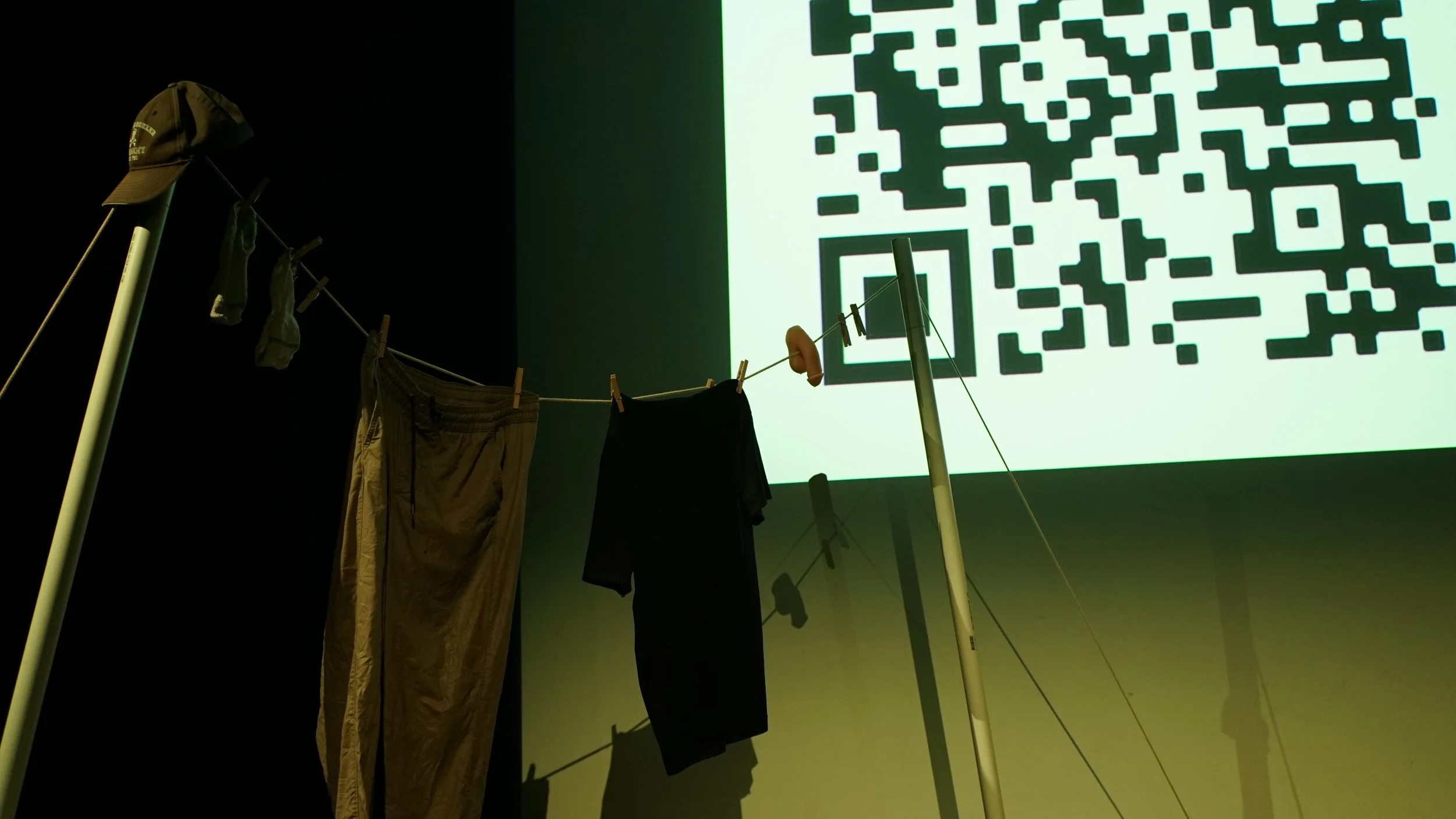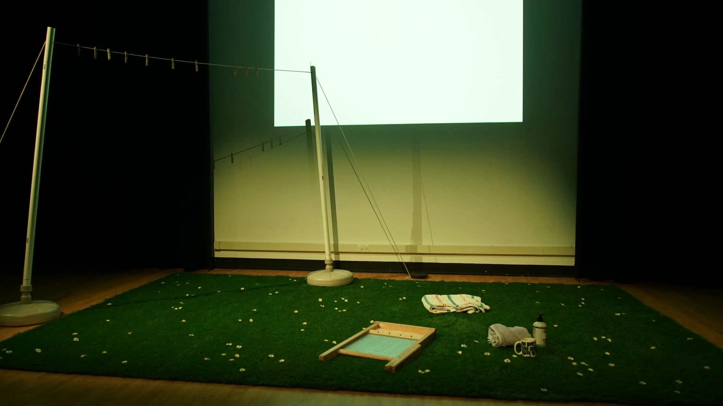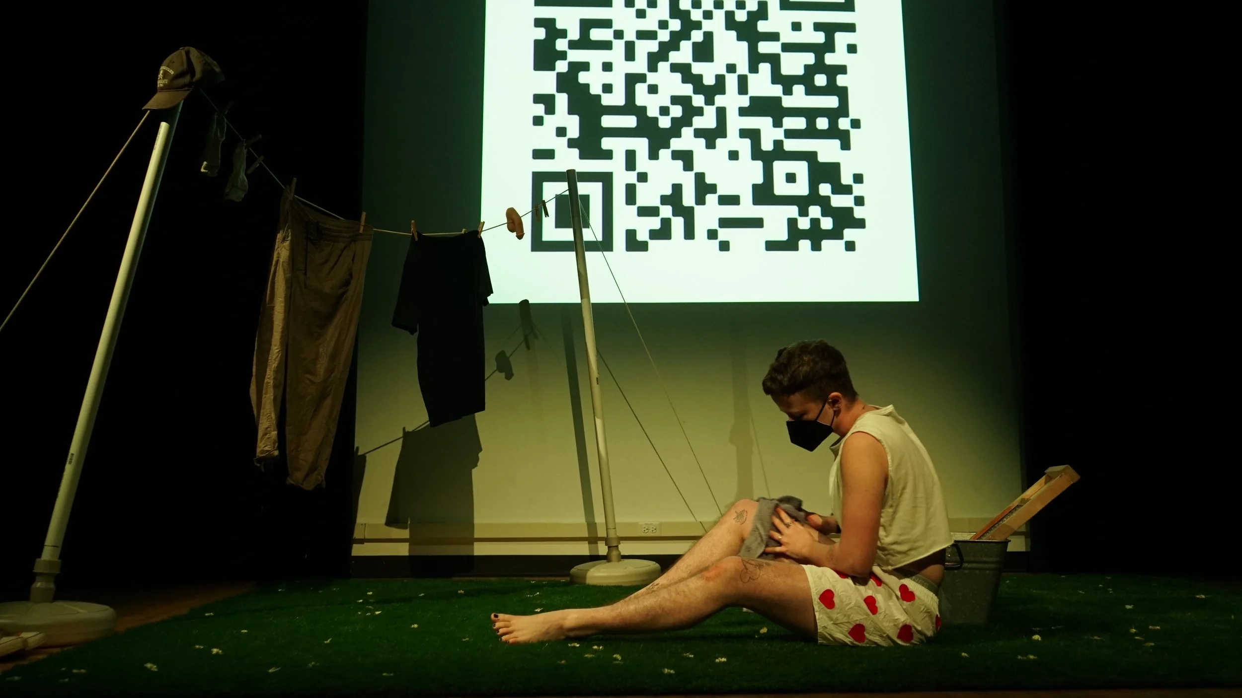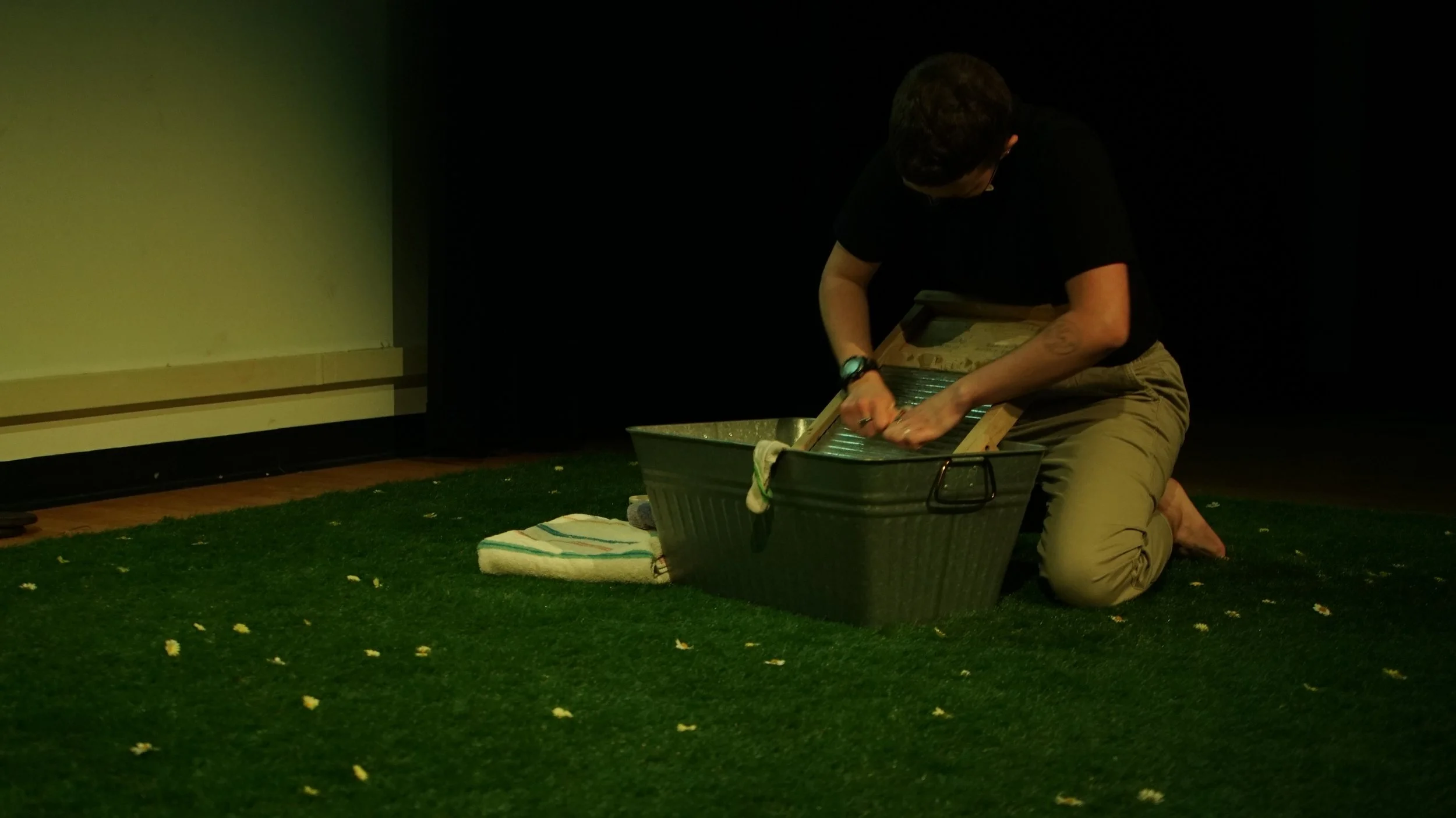 …Becoming Invisible is a seven minute durational performance in which the artist strips down and gently washes each article of clothing on a washboard that has been passed down to them through generations. After hanging the clothing to dry he is left in heart boxers and an undershirt and begins washing their own body. Just as gently as before, careful and thorough, he takes his time and when finished lays down and rests. “Everything Stays” by Rebecca Sugar then begins to play though it is not Rebecca who sings it, it is the artist three years prior before having started hormone therapy who sings the song. The audience is left with a QR code that warns to not step on the grass and leads to care instructions while the artist lays quietly listening to the birds and their younger self singing about time slowly changing how things are seen.